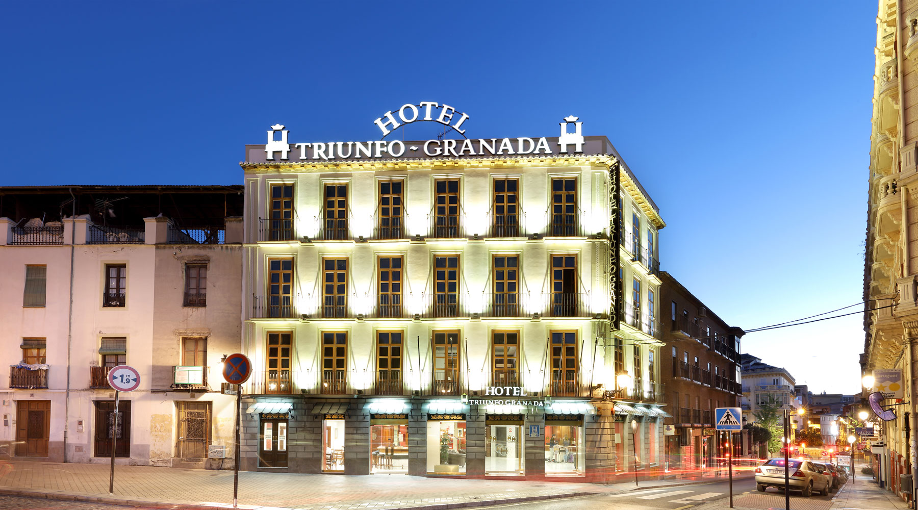 Straight on, (PHOTO 2), you will see The Granada Center Hotel on your right. When you see a tunnel, leave it on your left, and keep to the right lane. (PHOTO 3), Will come to an intersection with a large avenue (Avenida de la Constitución), turn right (PHOTO 4) and continue until you reach a roundabout with a big flag of Spain. ... Doc Retrieval